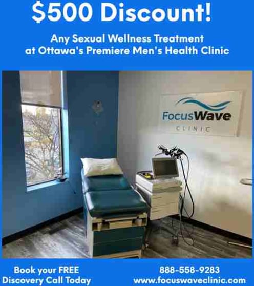 While applying the highest grade focused shockwave therapy technology, FocusWave Clinic’s mission is to be Canada’s premiere clinic for the treatment of1) Men’s Urogenital Health conditions (Erectile Dysfunction, Peyronie’s Disease, Premature E, Chronic Pelvic Pain Syndrome, Urinary Incontinence / BPH),